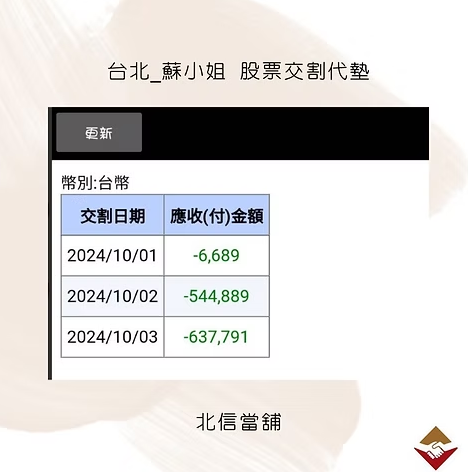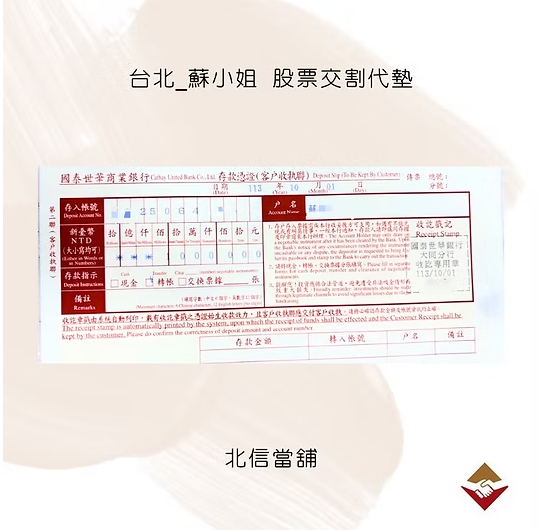 最終,蘇小姐選擇了具有73年經營歷史、政府合法立案的北信當舖。在專員的即時協助下,北信股票交割代墊在2024年10月1中午迅速撥款100萬元,避免造成違約交割,解除了她的資金壓力。