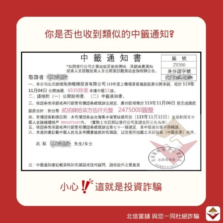 當天,Sam向北信當鋪專員諮詢,並傳來一張股票中籤的截圖,說明希望透過北信代墊資金。北信專員在仔細檢視截圖後,立刻察覺異樣,提醒Sam仔細斟酌此投資機會,並進一步說明,由於此服務非正統券商無法承接,並非合法交易所上的投資項目。