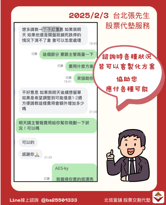 張先生是一位在台北工作的中年男子,最近因為家庭開支增加原有的資金彈性變小了,在股票操作上,需要一筆現金來解決當前的財務需求。經朋友推薦,他來到了北信當舖,希望通過股票代墊的方式來取得所需資金,避免產生違約交割的狀況。