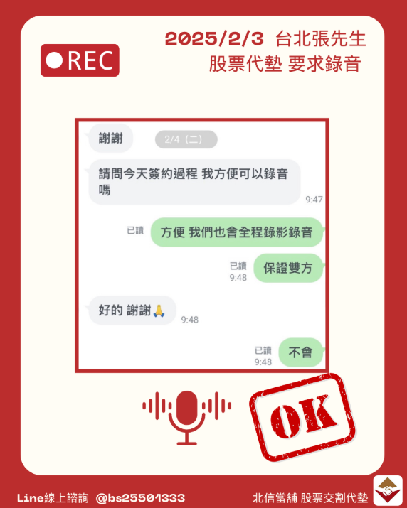 還有以其專業的服務態度和高度的誠信,在這個案例成功幫助張先生解決了財務需求。無論是對股票的深入分析,還是對未來風險的專業建議,北信當舖都展現出了高度的專業性和責任感。此外,透明公開的合約條款和全程錄影錄音的做法,進一步增強了客戶的信任,確保了每一筆交易的公平和透明。