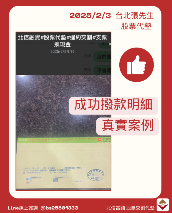 最終,張先生順利向北信當舖申請股票代墊款,成功撥款193萬元,解決了當前的財務需求。在整個過程中,張先生不僅得到了專業的建議,還感受到了北信當舖的誠信和透明的服務態度。