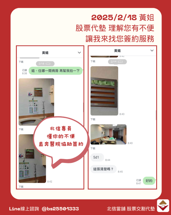 北信專員至醫院服務簽約,讓申請股票代墊不再是繁瑣的過程,而是貼心的支援。無論您身在何處,只要有資金需求,北信都能提供最適合的解決方案,確保您安心度過難關。