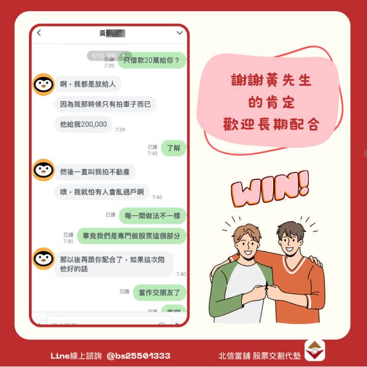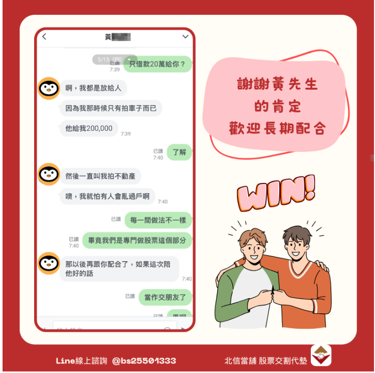 經由網路搜尋,黃先生發現北信當舖提供股票交割代墊的服務,且是專門針對此類情況設計的彈性方案。他於5月15日早上透過LINE聯繫北信小幫手,說明自己的股票持有情況與交割時間需求。