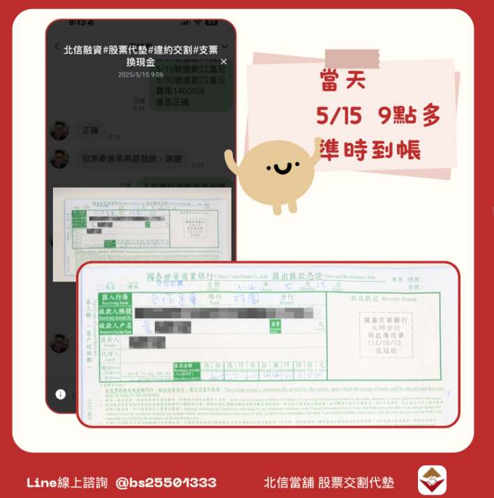 在確認股票資料與條件後,北信當晚即完成審核流程,並於晚間9點多完成撥款,讓黃先生能夠如期安排後續操作,在5月16日交割當天順利完成流程。