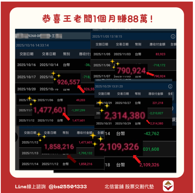 王先生一個月獲利88萬的成績,固然來自他對市場的判斷能力,但穩定的資金後援同樣功不可沒。北信當舖作為他的資金夥伴,讓每一筆交割都能如期完成,也讓獲利能夠持續累積。