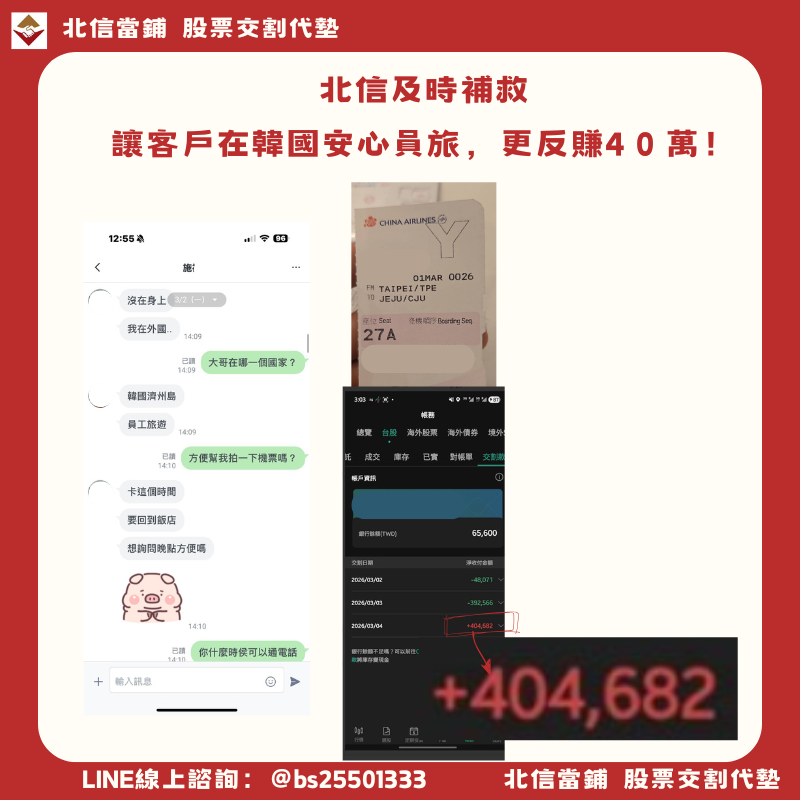 如果剛好帳戶現金不足、又遇上出差或出遊,缺口無法即時補足,就只能靠股票代墊來解決。關於代墊申請的安全性與流程,北信有完整的說明可以參考。