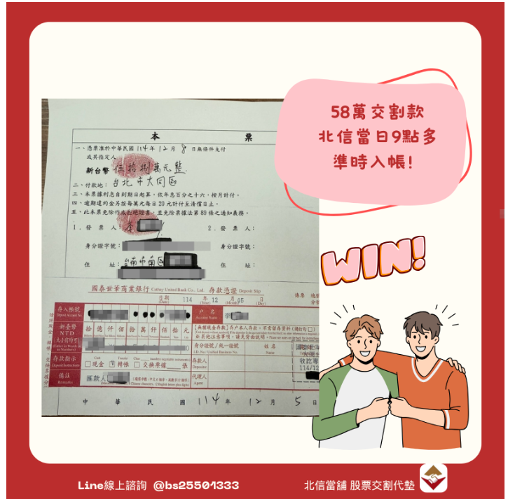 以下是台南李先生的真實經歷。他因為股票交割需要58萬,時間緊迫、沒有其他辦法,卻又對網路上的代墊業者充滿戒心。最後北信用實際行動證明了自己,在交割日當天早上8:50準時將款項匯入,讓李先生順利完成交割。